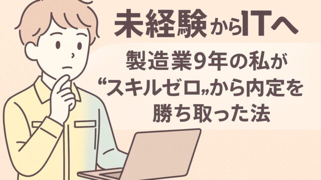 お金の最適化 未経験からITへ。製造業9年の私が“スキルのない不安”を乗り越えて転職を成功させた方法 2025年11月11日 れおなるど・ゆう はじめに|9年間の安定より、1年の成長を選んだ話 製造業で9年間働き、収入も人間関係も安定していた。そんな環境からあえて飛び出し、“ …