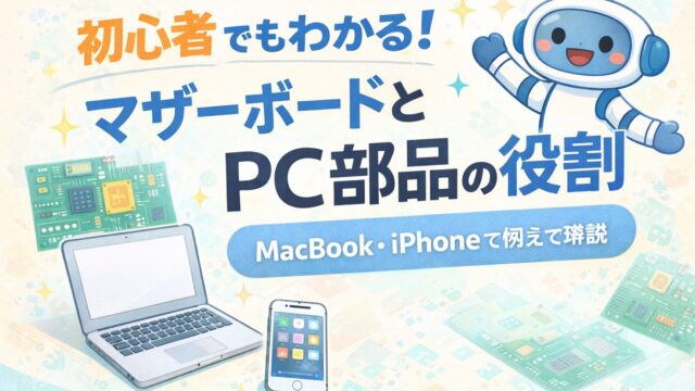 ハードウェアの基礎 初心者で学んだ!マザーボードと部品の役割 2025年12月21日 れおなるど・ゆう MacBook・iPhoneで例えると一瞬でわかるハードウェア入門 マザーボードとは何か マザーボードの役割 マザーボードは、すべての部品をつなぐ中心の板です。 …